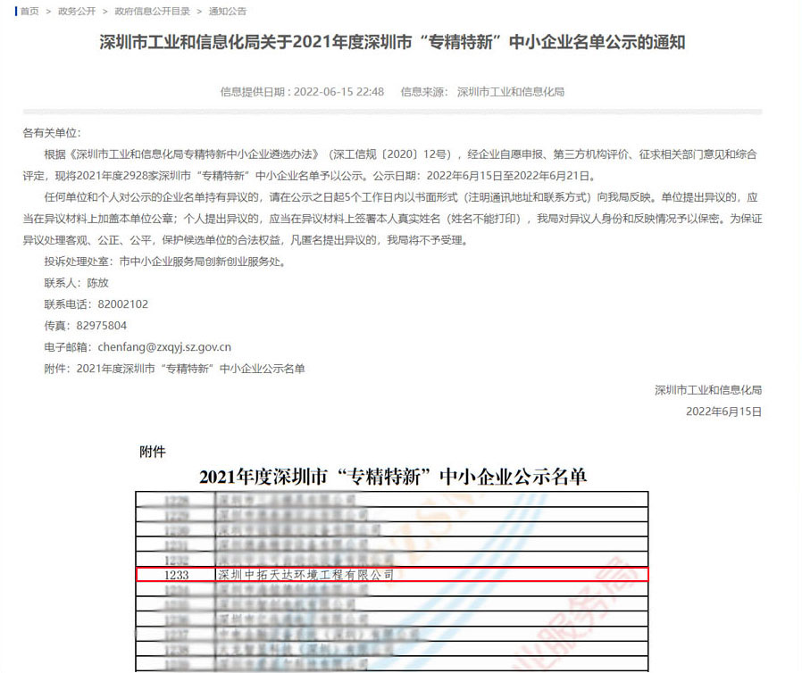6月15日,深圳市工業和信息化局發布2021年度深圳市“專精特新”中小企業名單公示通知,中拓環境入選為2021年深圳市“專精特新”中小企業。